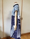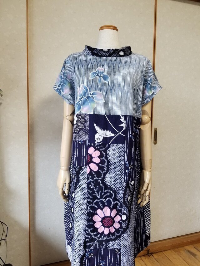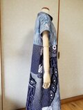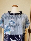 トップに優しい色合いの浴衣地を、襟には肌触りも柔らかな絞りの浴衣地、スカート部分には何種類もの浴衣地をパッチパッチしました。