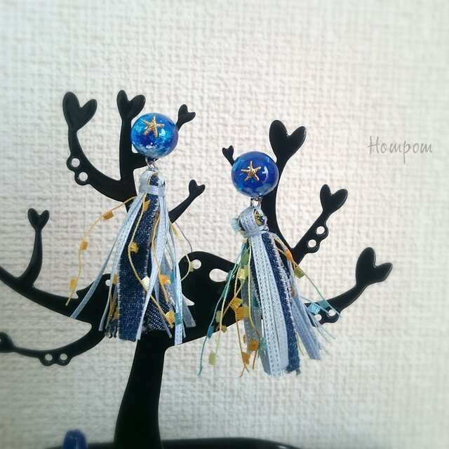 #夏 #タッセルピアス #デニムタッセル #ヒトデ #星 #ヒトデ #ノンアレルギー #ステンレスピアス #青 #水色 #ラメ #ブルー #ピアス #イヤリング #ステンレス #ハンドメイド #浴衣 #七夕 #おとなかわいい #ホムポム