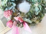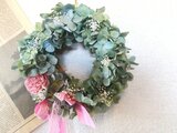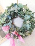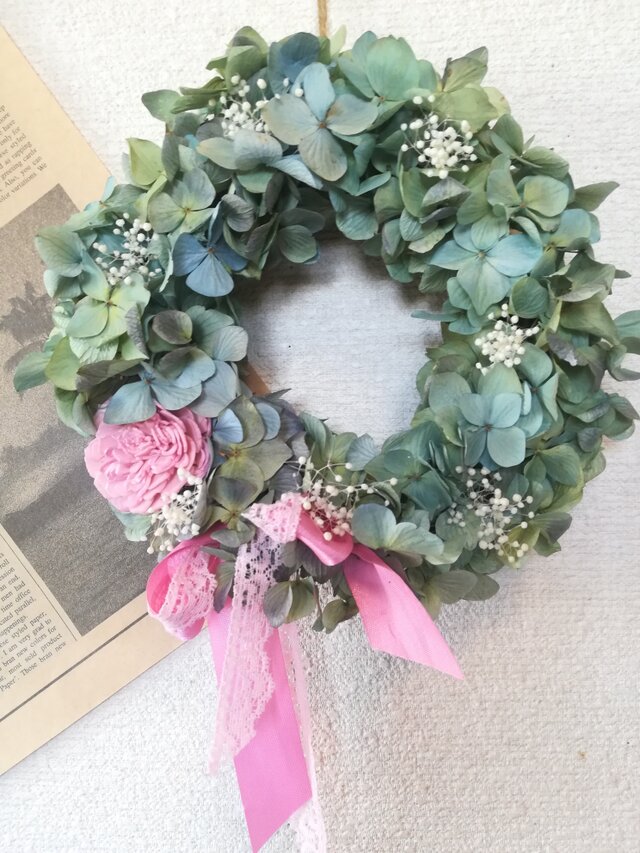 コントラストの綺麗なブルーの秋色あじさいと、ピンクのソーラーローズをアレンジしたシンプルでナチュラルなリースです。
