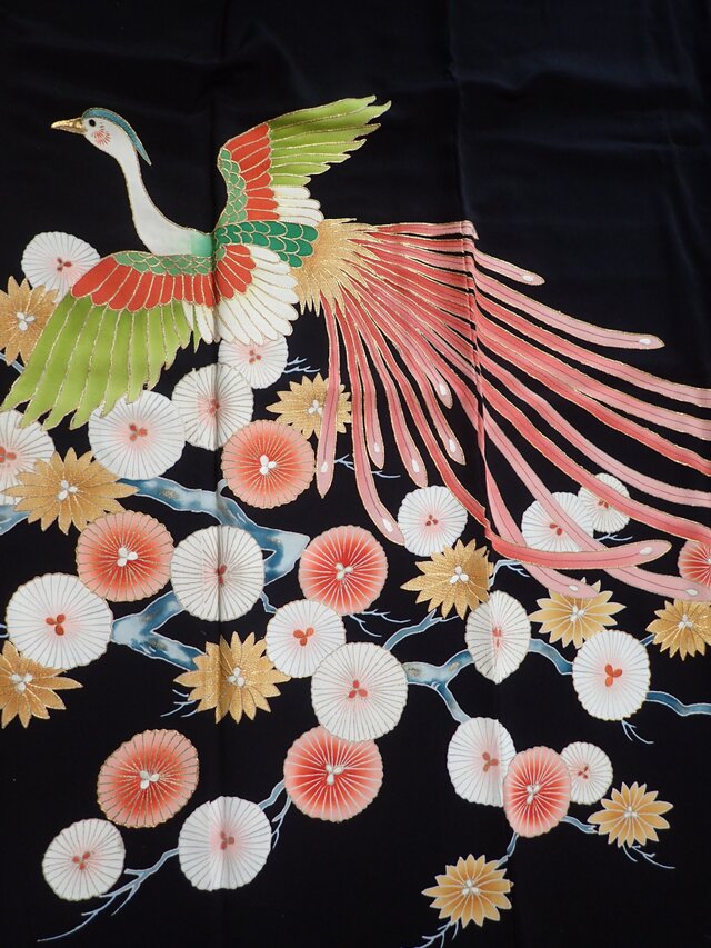 繊細で美しく優美な孔雀が優雅な花々を散りばめ、奏で長れる様な素敵なアンティーク着物をほどいて、画像デザインのフォーマルワンピースをお作りいたします。