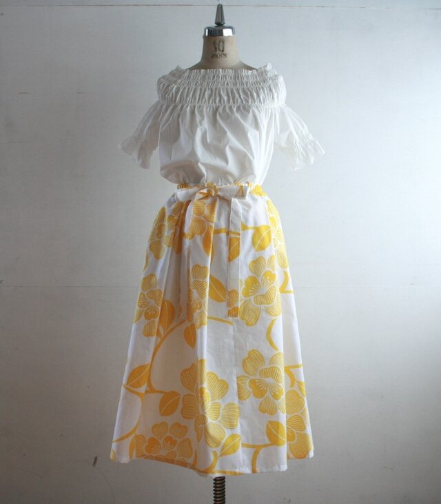 明るい色味が素敵な浴衣生地でゴムスカートを作りました。ゴムを通すことで自然なギャザーができるシンプルなスカートです。ロング丈ですが、ベルト部分のリボンで可愛らしい印象になります。