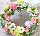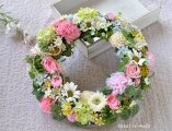 ライトピンクやホットピンクのカーネーション、マーガレット、ころんとした花顔のバラ、そして小花をふんわりと。スノーボールはライトグリーンやライトブルーをアクセントに。小花も 愛らしく咲きそろうピンク色のリースです。