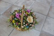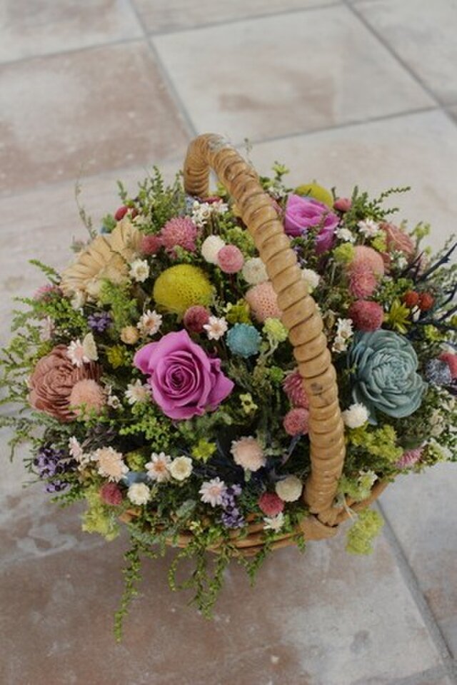 アンティーク風のかごにプリザーブドフラワーとドライフラワーのミックスアレンジです。