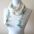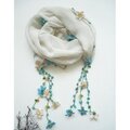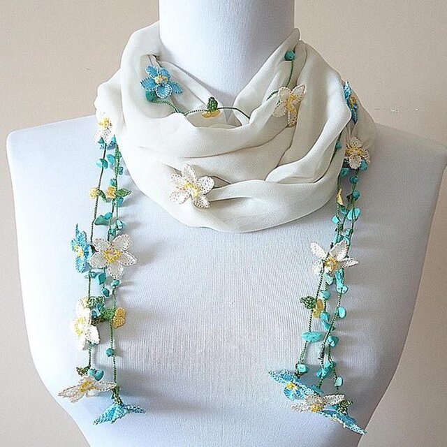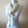 刺繍のお花付き シフォンスカーフのロングラリエット クリーム&ターコイズ