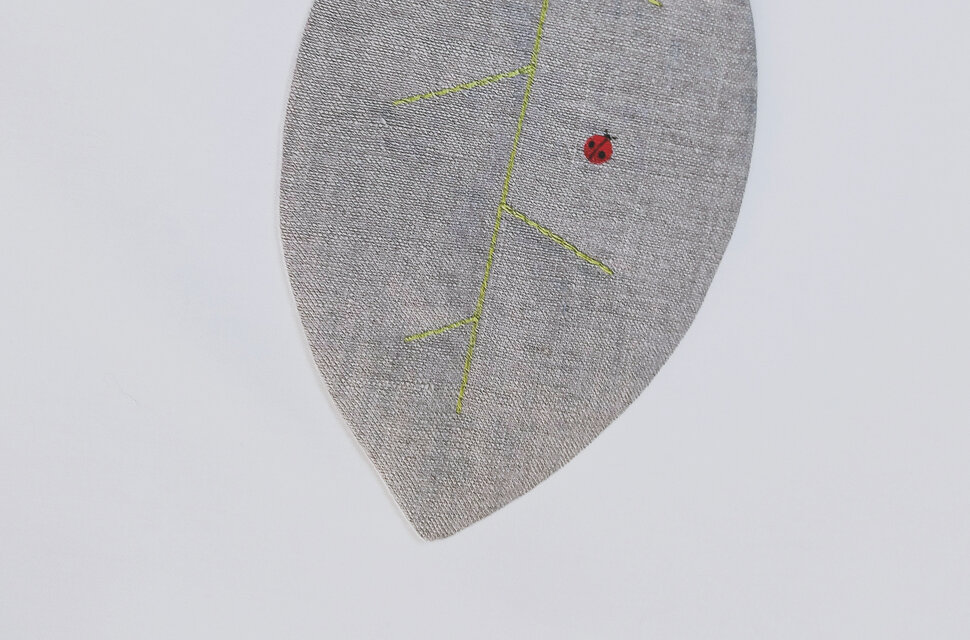 我が家の花桃の葉にやって来たてんとう虫をモチーフに取り入れて…