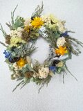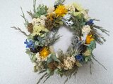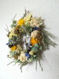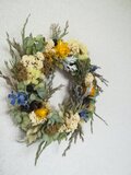あじさい、カイガラソウ、デルフィニウム、コバンソウ、シロタエギクなどをアレンジした動きのあるリースです。