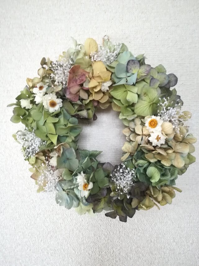 カイガラソウ、デルフィニウム、コバンソウ、シロタエギク、あじさいなどをアレンジしたシンプルでナチュラルなリースです。