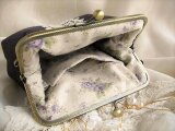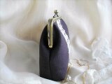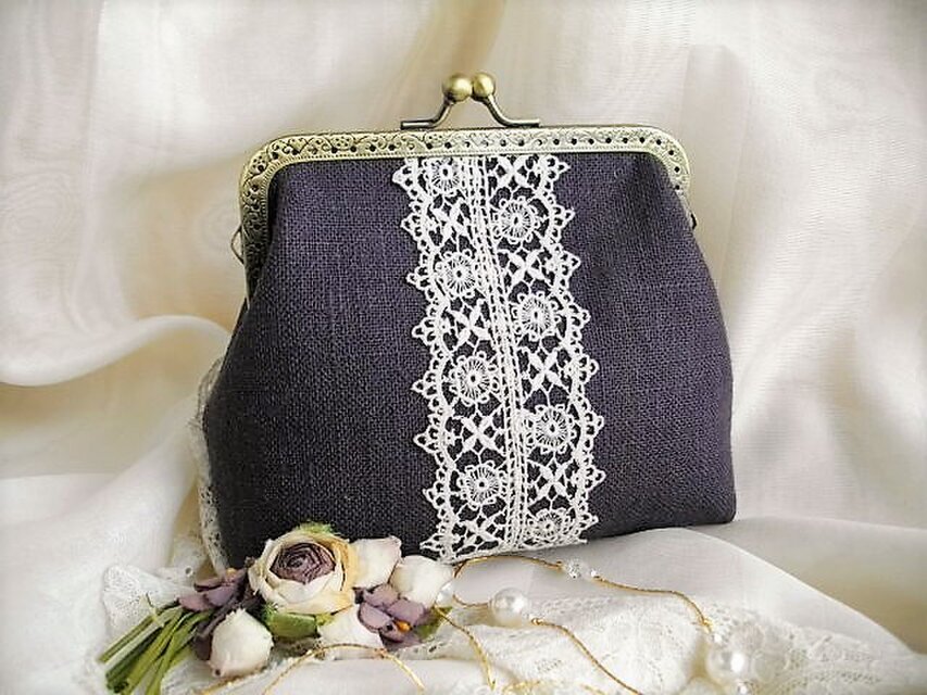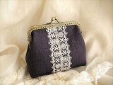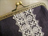 ダークブラウンに近いシックな色合のパープルリネンにアンティークレースをのせたがま口ポーチ