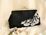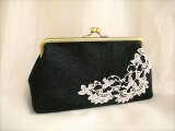 黒リネンにアンティークモチーフレースをのせたがま口ポーチ