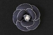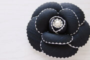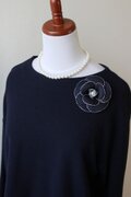 カメリア(つばき)の端正な輪かくを際立たせたコサージュです。ネイビーブルーのシルクシャンタンに、アイボリーのウールを使用。中心にパールをあしらって華やかに仕上げました。