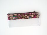 リバティの人気生地、Fergus ファーガス(ブラウン)のラミネート生地(つや有)で開けなくても中身が見える便利なクリアポーチ(横長)を作りました。