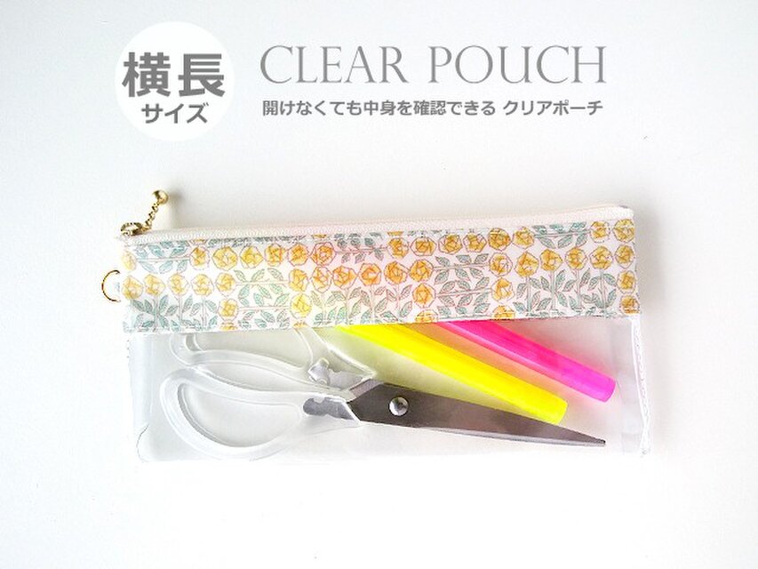 リバティの人気生地、(ビニールコーティングつや無)、スリーピングローズ Sleeping Rose(イエロー)で開けなくても中身が見える便利なクリアポーチ(横長)を作りました。