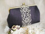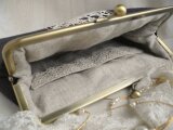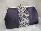 ダークブラウンに近いシックな色合のパープルリネンにアンティークレースをのせたがま口ポーチ