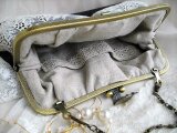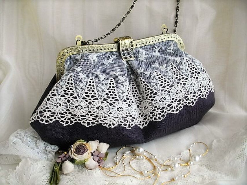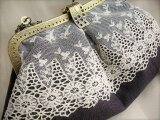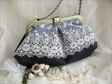 ダークブラウンに近いシックな色合のパープルリネンにアンティークレースをのせたがま口バッグ
