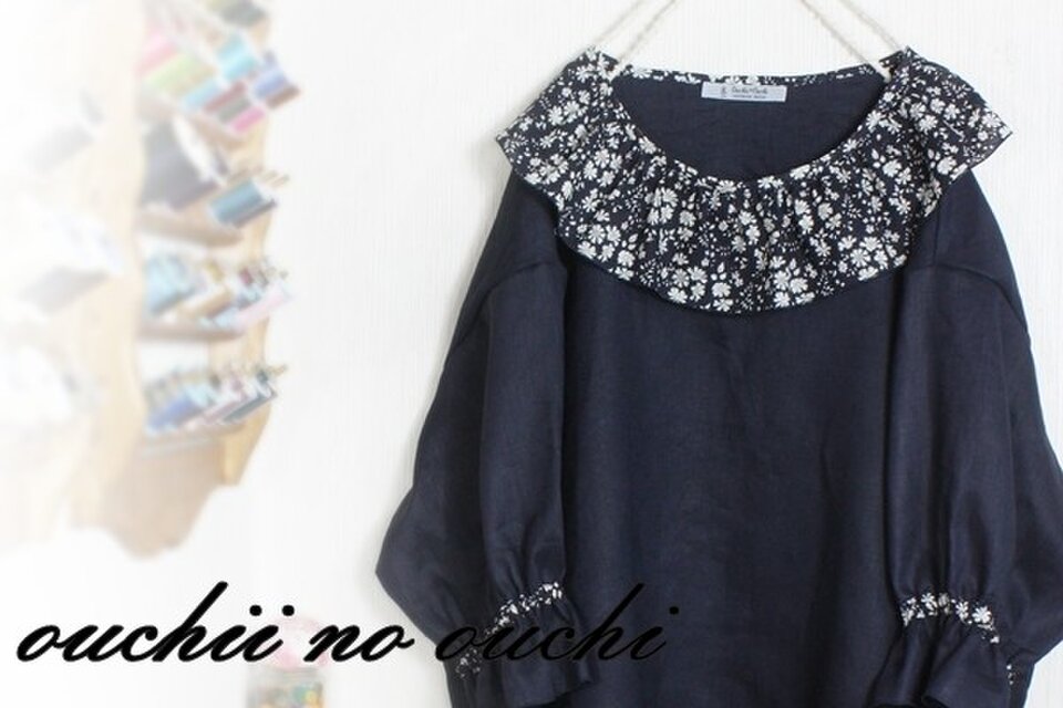 しっとりリネン定番ネイビーとリバティタナローンの人気柄Capel カペルでキャンディスリーブラウスをおつくりしました。
