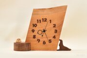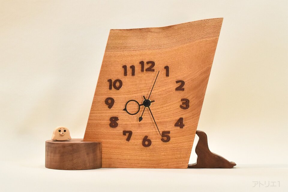 日本を代表する樹木で耐朽性、保存性がよく最良の材質の木とも言われるけやきは、お寺や家の大黒柱に好まれて使われる建築材としてだけでなく、太鼓や和家具の最高級品としても重用されています。そんなけやきを垂直方向を斜めにすることで、まるで倒れそうな印象になるように切り出し、オットセイを配して倒れそうな時計を支えるコミカルなデザインの時計に仕上げました。