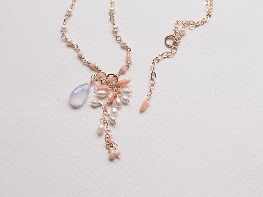ブルーカルセドニー、珊瑚と淡水パールのパーツはチャーム仕立てになっておりますので