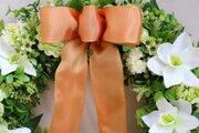 ユーチャリスをメインにした上品な印象のリースです。明るいグリーンの葉ものと白いユーチャリスの組み合わせがとてもさわやかでこれからの季節にぴったり。控えめなオレンジ系のリボンが優しい雰囲気のアクセントになっています。