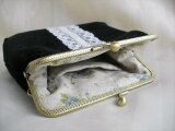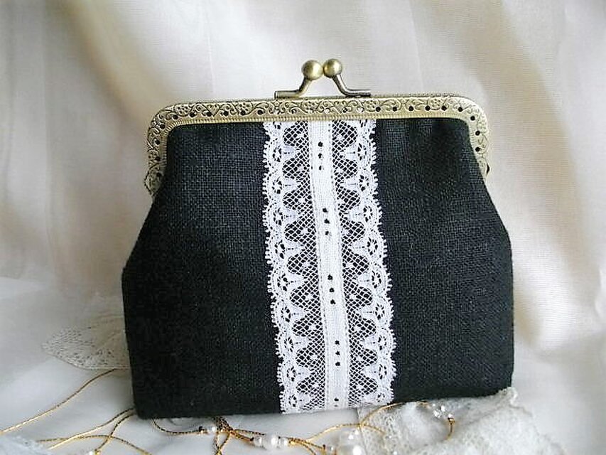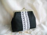 黒リネンにアンティークレースをのせたがま口ポーチ