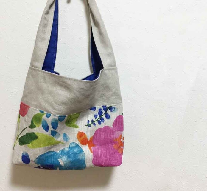 きれいな花模様とナチュラル麻生地を合わせたバッグです。