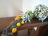 黄色いまん丸なグラスぺリアグラスペリアグロボーサ、青みを帯びたエリンジウム、ミモザ、ハイブリッドスターチス、クリスマスローズなどをアレンジしたナチュラルでシンプルなスワッグです。