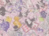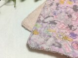 淡いパステルカラーで、不思議の国のアリスとトランプや時計うさぎ、チェシャ猫などのモチーフがたくさん描かれたダブルガーゼと無地のタオル地を合わせて、ハンカチを作りました。