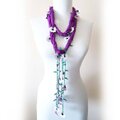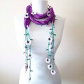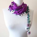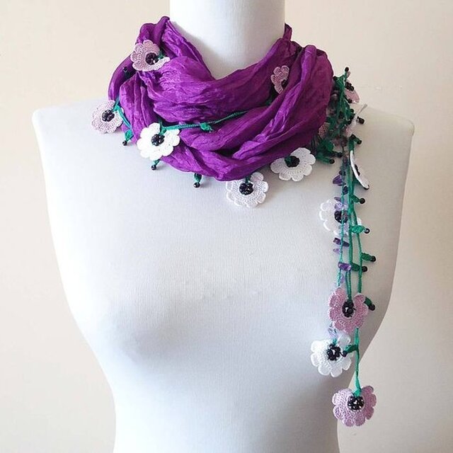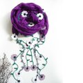 刺繍のお花付き シルクスカーフのロングラリエット パープル