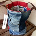 (底面はデニムと赤です。※持ち手のパーツ打ち込み金具が、ロゴタグ部分に重なってしまいました。次回からは気を付けます。ごめんなさい。。。。)