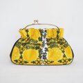 がま口部分が持ち手になっているハンドバッグ。