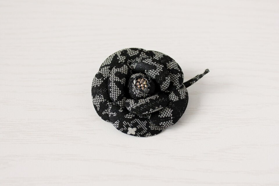 和シルクで仕立てた小さめのカメリア(つばき)のコサージュです。繊細な織り模様がレースのようです。ミニサイズなのでブローチのように気軽に着けられます。シンプルな装いのワンポイントにどうぞ。