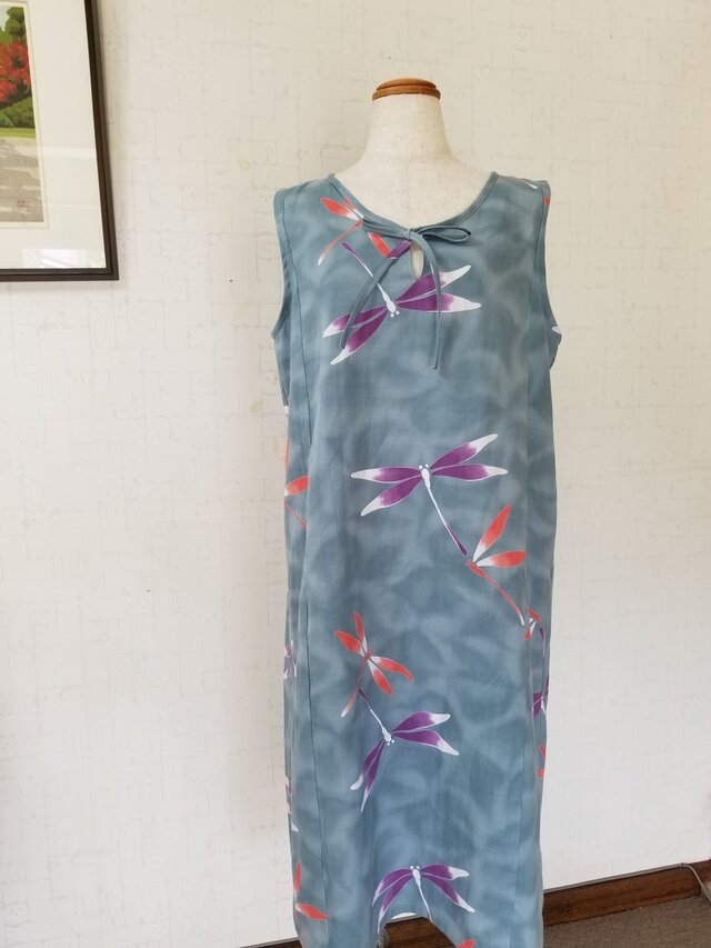少しグレーがかった淡いブルーのムラ染のような地色に、大きなトンボが描かれている浴衣から、ノースリーブワンピースに仕立てました。