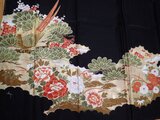 繊細で美しく優美な孔雀と華やかな牡丹の花々が奏で長れる様な素敵なアンティーク着物をほどいて、画像デザインのフォーマルワンピースをお作りいたします。