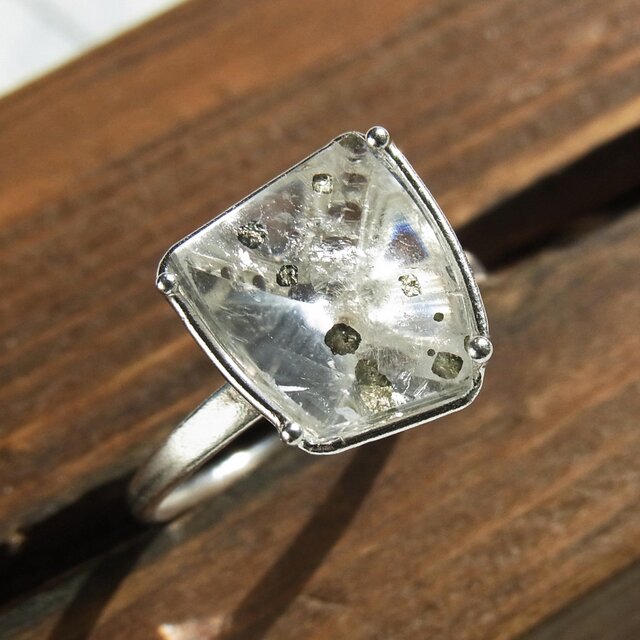 個性的な台形のカットが施された、パイライト イン クオーツのリング。