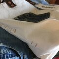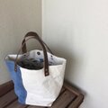 (底面はデニムと生成りです。※持ち手のパーツ打ち込み金具が、ロゴタグ部分に重なってしまいました。次回からは気を付けます。ごめんなさい。。。。)