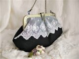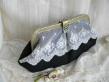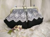 黒リネンにアンティーク刺繍チュールレースをのせたがま口バッグ