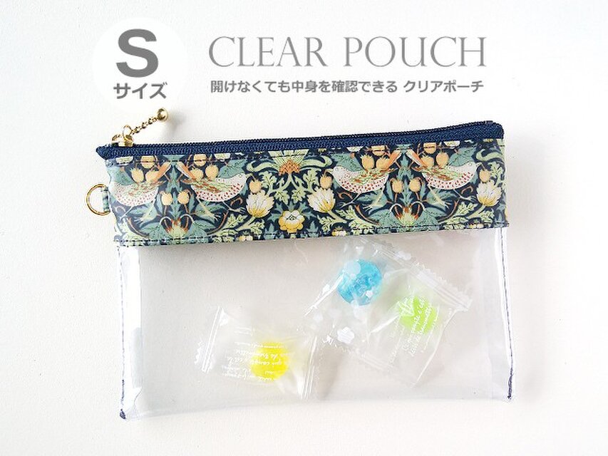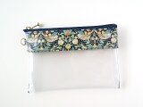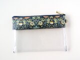 リバティの人気生地(ラミネートつや無し)、Strawbery Thief ストロベリーシーフ(グリーン)で中身が見えるクリアポーチSサイズを作りました。