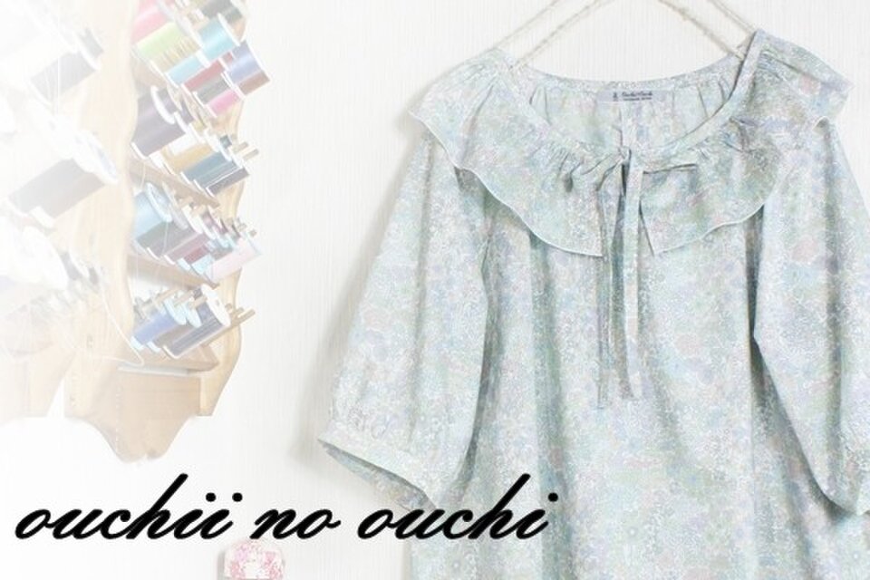 ライトグリーン ブルー系で巻きロック仕上げのフリル襟リボンラグランロングブラウスを作りました。