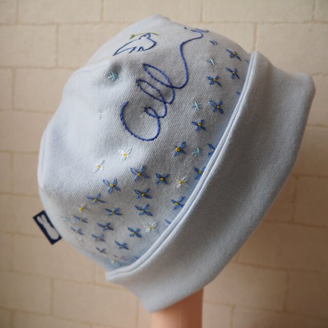 コットン素材スパンフライスニット生地で作ったニット帽(青い鳥)