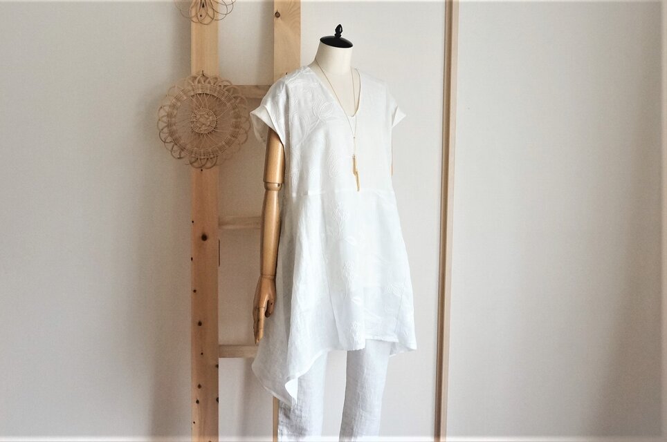 ボタニカル刺繍*パッチワークチュニック*1点もの*夏*フレンチスリーブ*リネン*コットン*BAB