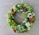 リース素材:アーティフィシャルフラワ-(造花):グリーンアップル・シュガーレッドアップル・デージー・グリーンラズベリー・白い実2種類・ユーカリ、など。自然素材:ノグルミ、など。