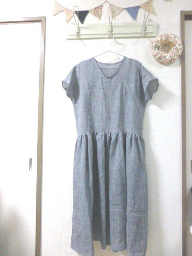 グレンチェックのリネン100%生地でギャザーたっぷりフレンチスリーブワンピースを作りました。