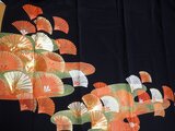 繊細で美しく優美な扇を見立てた花々が奏で長れる、素敵なアンティーク着物をほどいて、画像デザインのフォーマルワンピースをお作りいたします。