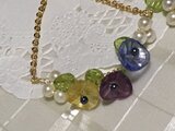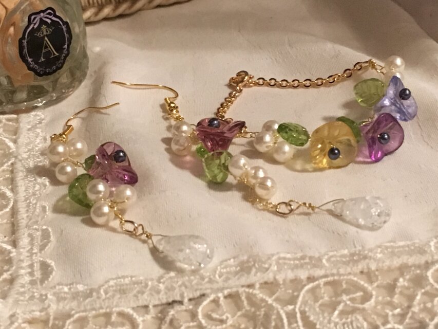 パールとアサガオのビーズのワイヤーでキラキラ編み込みました。