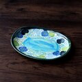 中央にターコイズブルーの釉薬を掛けて、湖水を表現し、その周囲に梅と流水紋様を描きました。