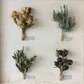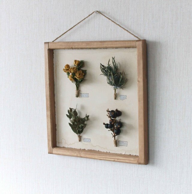 アンティーク調に仕上げた自家製フレームにドライフラワーを貼り付けました。