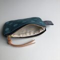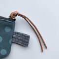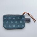 緑がかった青色(とても微妙なお色でくすみがあり沈んだ青緑色という感じです)の綿の8号帆布にハンドプリントで水玉(ドット)模様を施しポーチを制作致しました