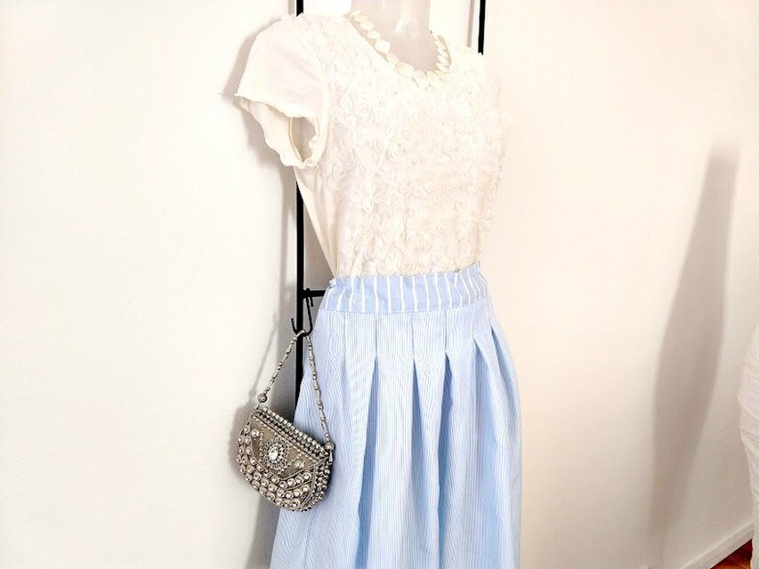 注)こちらのスカートは、最後の仕上げの時に私の不注意で左ウエスト下に細い糸のツレがあります。なので、訳アリ商品です。5番目の画像をご覧ください。