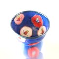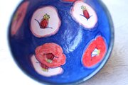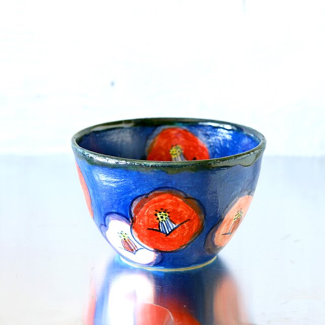 青い化粧泥を使った深いブルーの地に紅白のスマイルカメリアを散らしたbowlです。