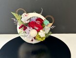 花材 : プリザーブドフラワー薔薇・小菊・紫陽花・ジニア・イモーテル・アスパラ・ミリオンダグラス・ドライフラワーデージー・シダローズ・プチフラワー・器(陶器)など