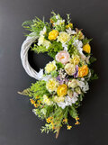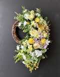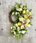 花材:アーティフィシャルフラワーローズ・紫陽花・ラナンキュラス・ガーベラ・ヒヤシンス・ベリー・ラベンダー・レースフラワー・ユーカリ・シダーなど